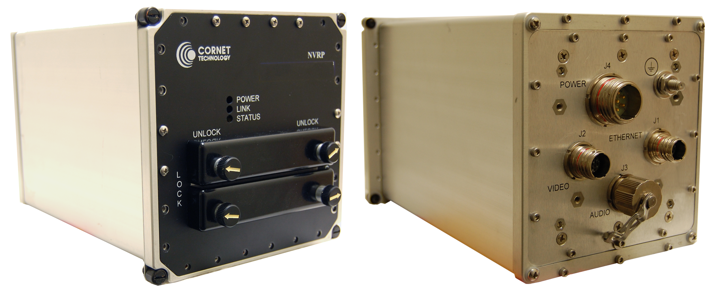 Recording of video and audio is on two solid-state 256 GB SATA hard drives. Users control play, pause, and stop settings as well as unicast/multicast, IP addresses, port numbers, start-time, source etc.. All external user interfaces are on MIL-DTL-38999 circular connectors. The unit contains a Real Time Clock that is automatically updated via Network Time Protocol software from a local Time Server over the wired Ethernet interface.